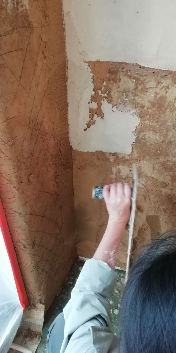 Des recettes ont donc été établies, et pendant que certain.es préparaient les enduits, d’autres protégeaient les sols-huisseries-plafonds, ou encore préparaient les murs en les brossant et en rebouchant les éventuels retraits ou petites fissures (très rares).