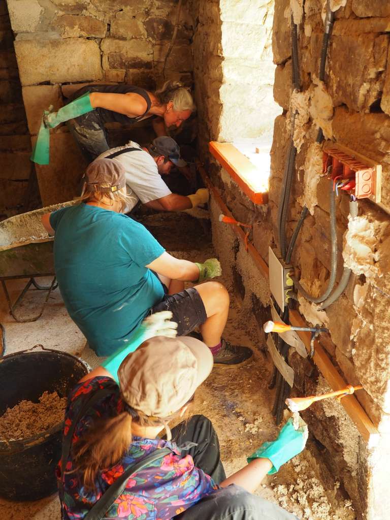 Nous avons réalisé beaucoup (vraiment beaucoup !) de types d'enduits différents sur ce chantier. Nous avons concentré 2 chantiers en 1 (des corps d'enduits / des finitions). On a donc réalisé des échantillons multiples, avec des terres, des sables, des chaux différentes, appris des gestes variés... c'était intense et riche ! et l'équipe a été au top pour que tout soit parfait, malgré la canicule. Bravo !