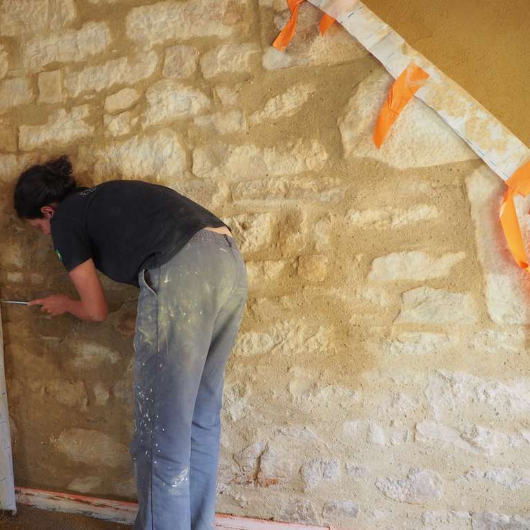 - Rejointoiement en chaux sable pour le mur de refend en pierres vues.