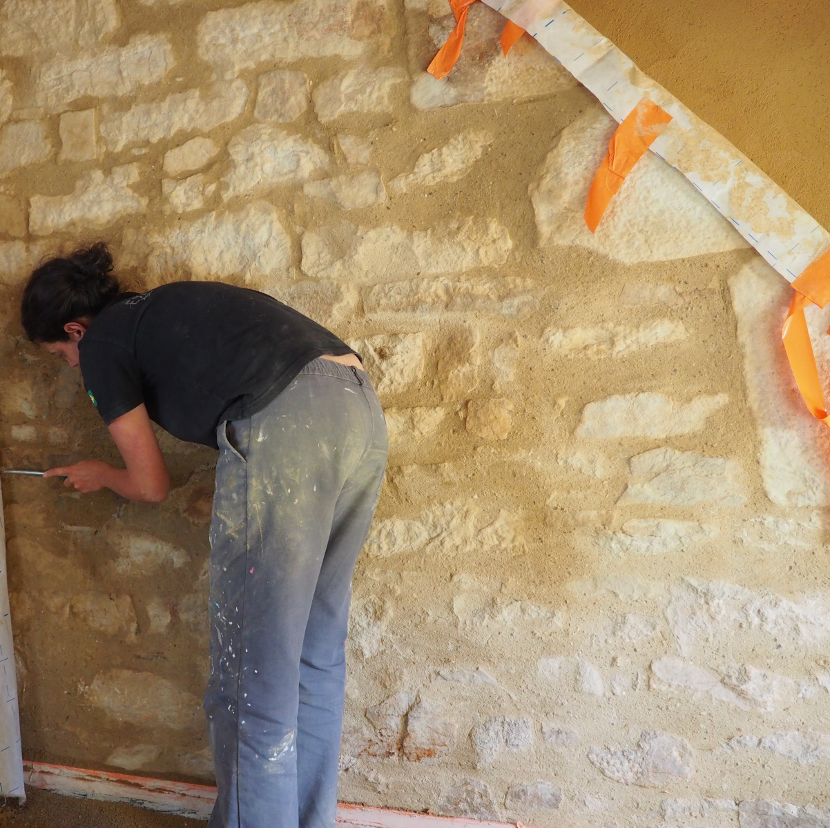 - Enduits de finition en chaux-chanvre et terre pour les sous bassement des murs en correction thermique.
