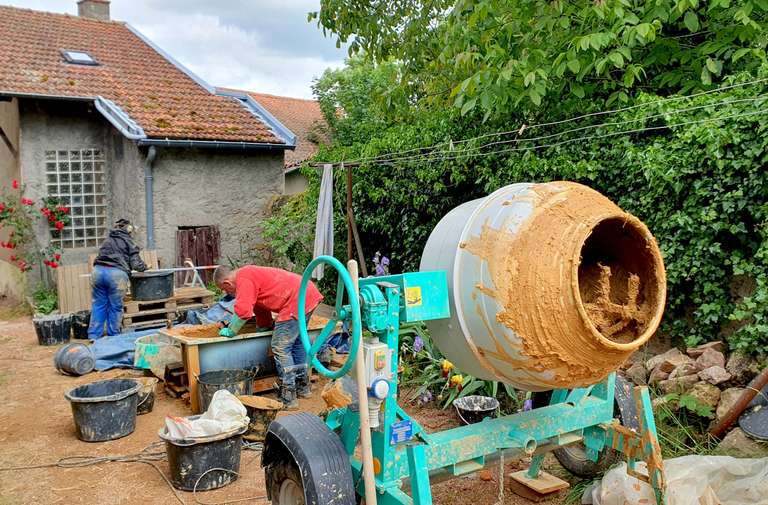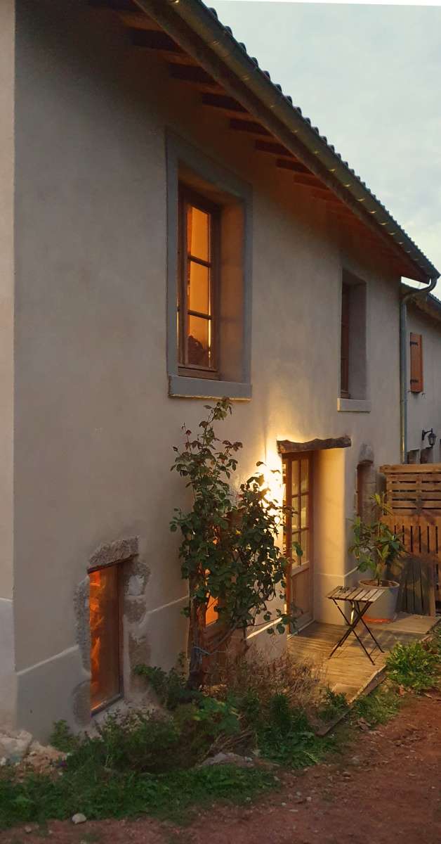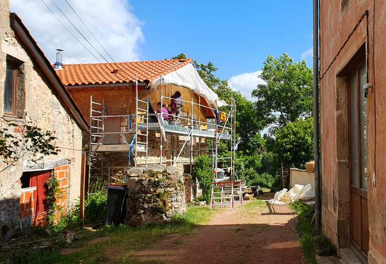 Sur les coteaux entre Roanne et les montagnes auvergnates, je rénove une petite maison en pierres, maçonnées à la terre, dans le charmant bourg du village d'Ambierle. La partie habitation est à l'étage, et le niveau bas, semi enterré, est un atelier et lieu de stockage pour mes activités de maçonne enduiseuse, (et aussi un peu de céramique). La rénovation a commencé il y a une dizaine d'année, et le temps est enfin venu de la dernière étape : les enduits des façades !