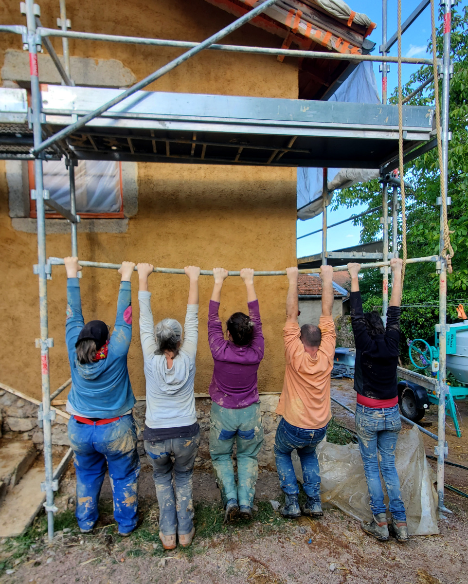 - application de l'enduit terre-paille-chaux à la main, dressage à la règle, et création d'accroche pour la finition, de 2 façades (et demi !)