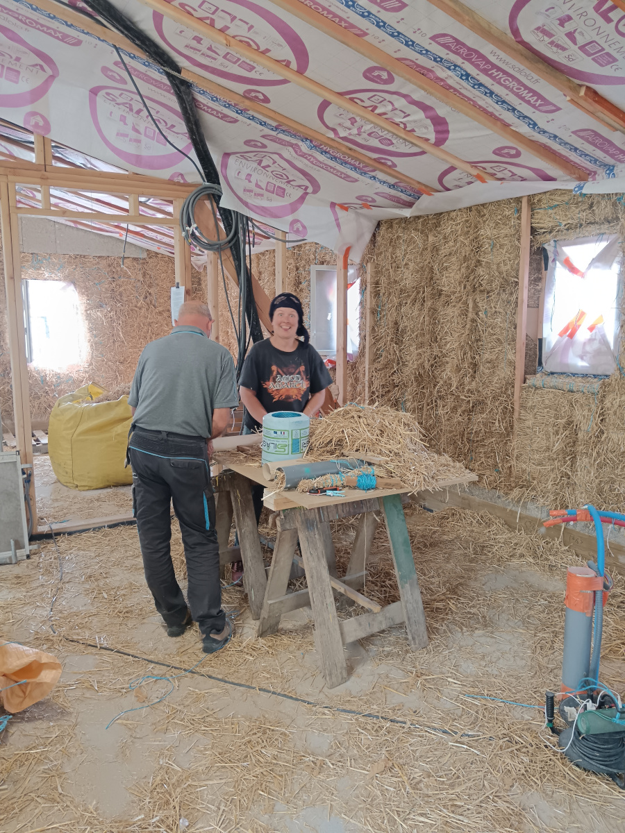 Nous sommes partis sur la construction d’une maison en ossature bois, isolation paille et enduit de terre. Nous avons pu participer à la construction des murs de notre maison, en collaboration avec le charpentier/(?)menuisier.