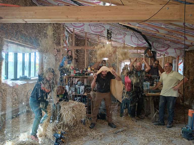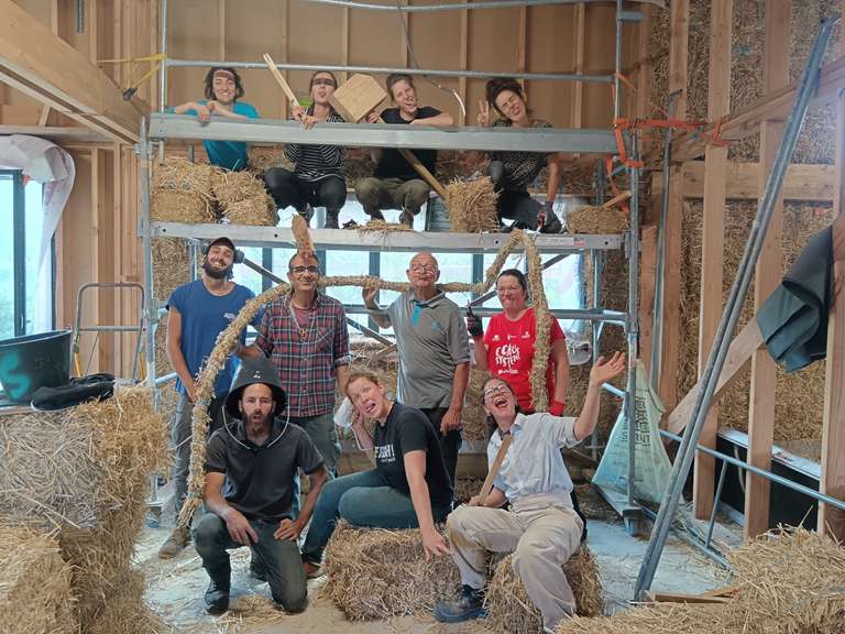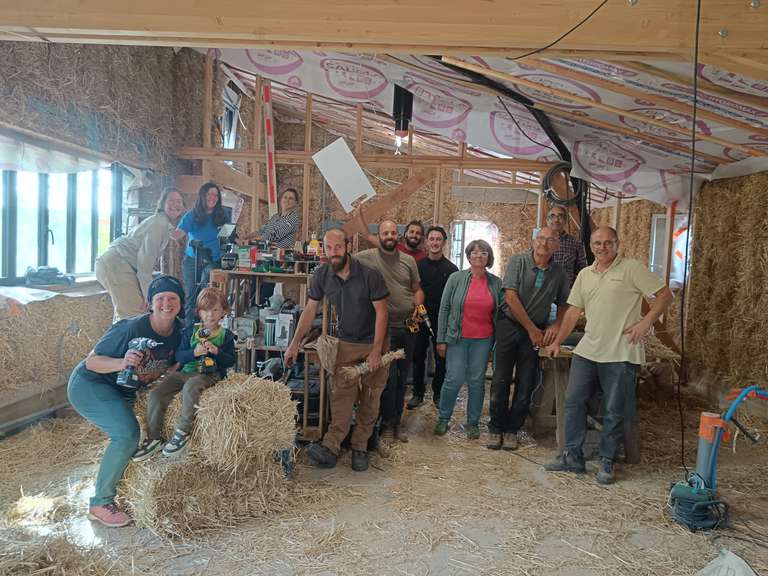 Le dernier jeudi du chantier, un apéro découverte et pratique a été organisé pour accueillir plus largement les personnes curieuses du projet et de la construction paille.