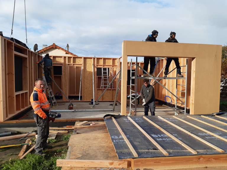 La construction de l’ossature bois a débuté en octobre 2025. Le rez-de-chaussée et le plancher de l’étage ont été levés et posés en novembre 2025. La construction des murs de l’étage a débuté en janvier 2026, s’ensuivra la charpente, le bardage extérieur, la couverture et la pose des menuiseries. Notre objectif est d’obtenir une maison hors d’eau et hors d’air pour avril afin de pouvoir débuter l’isolation.